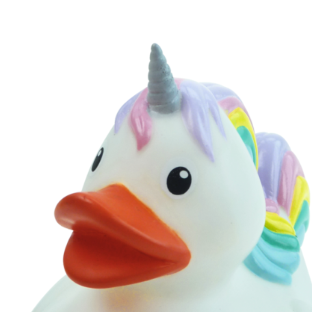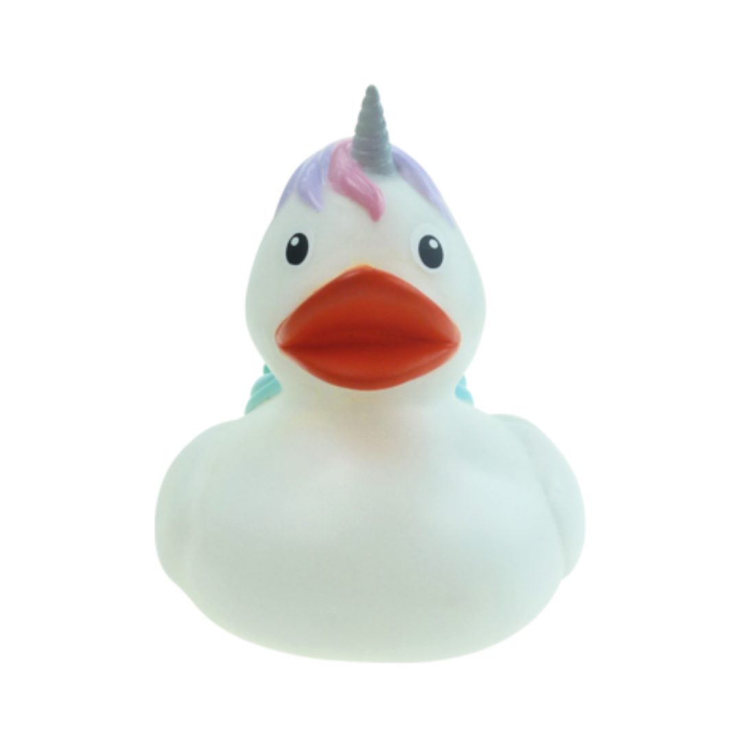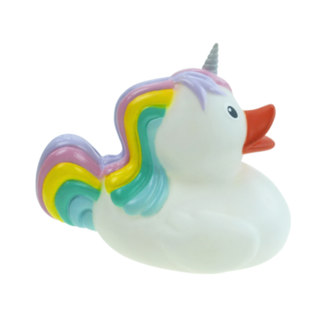 Den helt store dille hos pigerne lige nu er enhjørninger. Enhjørningen bringer farver, fantasi og magi med sig. Med sit eventyrlige udtryk er den perfekt til leg i svømmebadet eller en sød gave fra svømmeshoppen. Den vil med garanti få et smil frem hos både børn og voksne. Badeanden måler 8 cm.