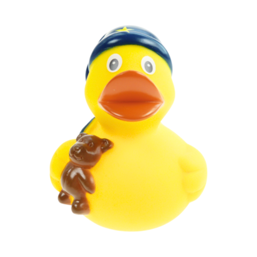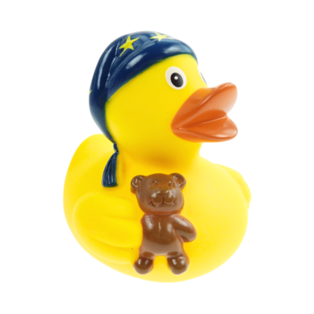 Badeanden der altid er klar til at sige godnat. Så sød og fin med bamse og nathue og den fineste gule farve. Helt klar til at blive vugget i søvn af de små bølger.