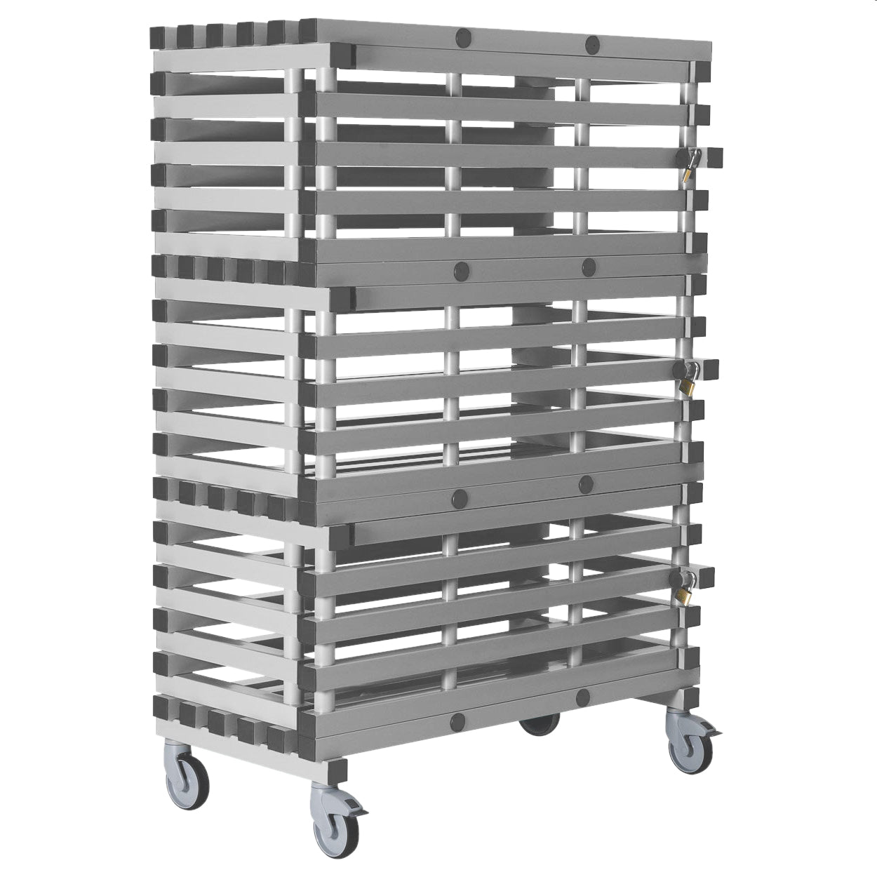 Rekvisitskab lavet i rustfri materialer, til brug i svømmehaller. Skabet har tre sektioner, som alle kan låses individuelt. Skabet er lavet med fire hjul, to med lås. Kan indeholde 9 rekvisitkurve. Størrelse: 138 x 82 x 205 cm.